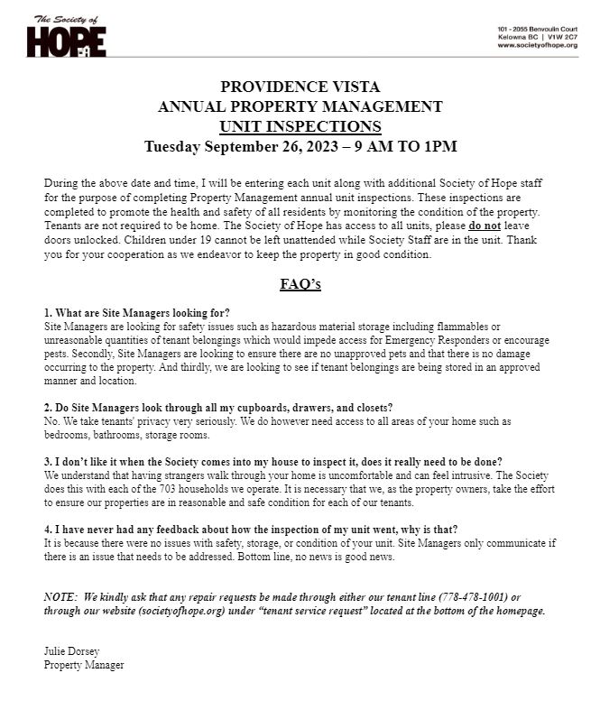 Providence Vista Unit Inspections – 2023